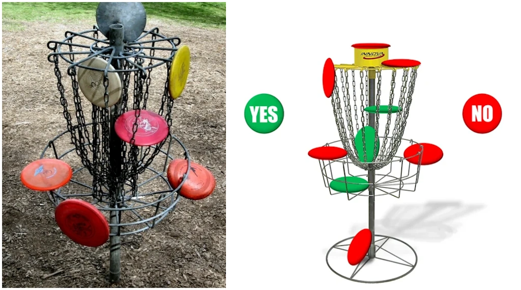 Det som ikke teller som i kurv: Hvis discen treffer kurven, spretter ut, og lander på bakken. Det spiller ingen rolle at den traff kurven, discen er ikke i kurven før den hviler inne i selve kurven eller er fanget i kjettingene.