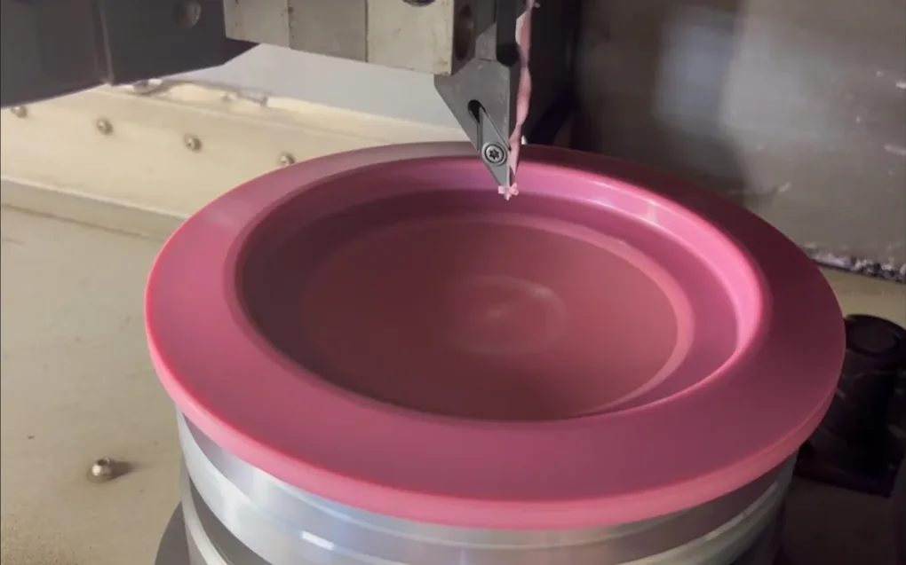 I motsetning til støping, der formen avhenger av plastens kjøling og kjemi, skjæres discen her i sin nøyaktige form fra et plastemne ved hjelp av datastyrte skjæreverktøy. Denne prosessen eliminerer mange av de geometriske inkonsekvensene som kan oppstå i sprøytestøping som følge av ulik kjøletid, farge eller plastkjemi. CNC-lagde discer unngår også det tynne plastoverskuddet kalt flashing, som vanligvis finnes langs støpesømmen på sprøytestøpte discer.