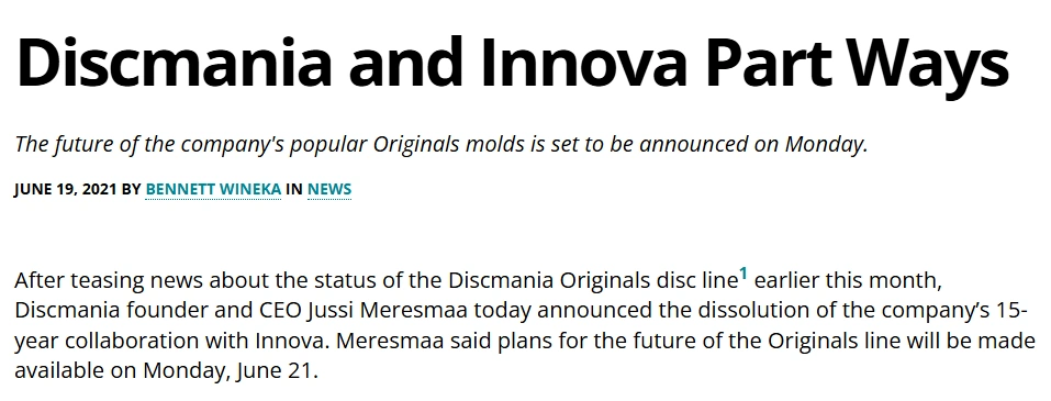 «Questions about the Innova/Discmania split : r/discgolf – Reddit.» Publisert: 22. desember 2021.