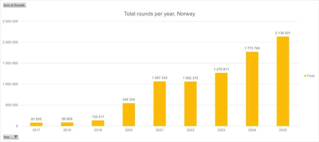 And players don’t just try it once, they stick with it. With an average of 42 rounds logged per registered player, Norwegians play far more consistently than in many other countries, where the majority of registered users try a few rounds and never return. In Norway, disc golf is a lasting hobby for many.